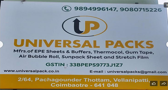 Universal Packs is a Leading Manufacturer of EPE Sheets and Buffers,, Thermocol , Gum Tapes , Air Bubble Rolls, Sunpack Sheets , Stretch Films and all Kinds of Packaging Materials since 2014 in Coimbatore, Tamil Nadu