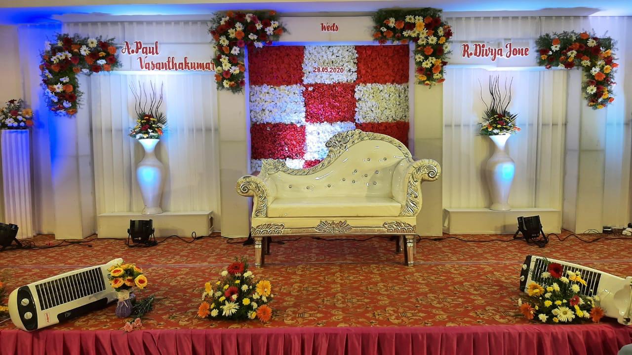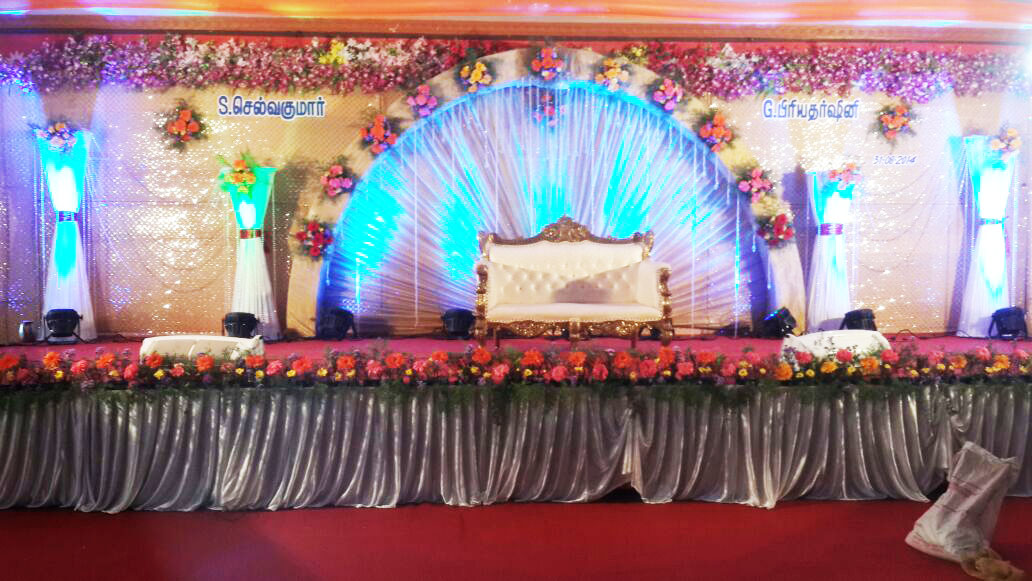 We are involved in Invitation printing, Panthal Arrangements, Photography & Video, Food, Light and Sound Stage Backdrop, Cake, Floral Decoration, Car & Transport Arrangements, Band & Nadaswaram, Orchestra, Bride & Groom Makeup, Hotel Arrangements.