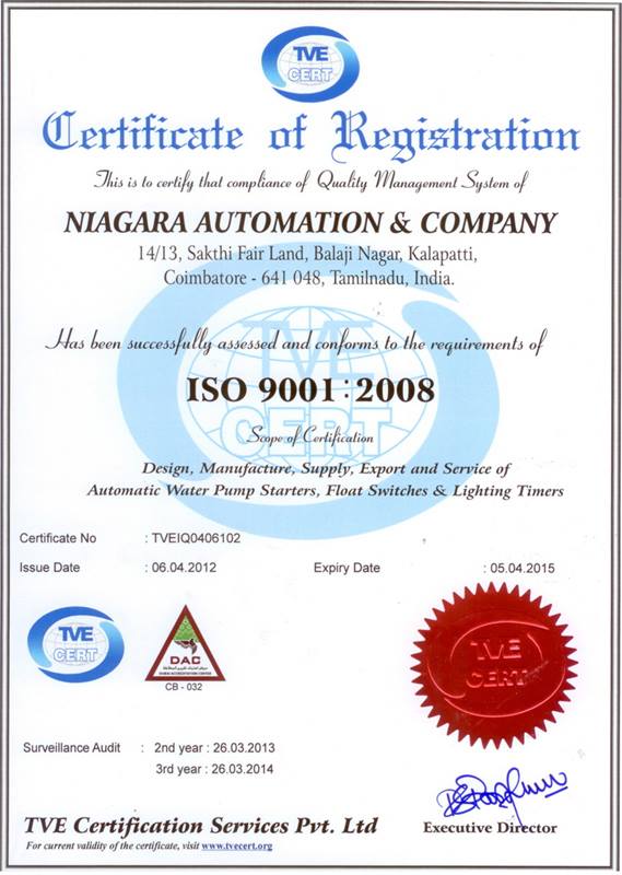Niagara Automation & Company was established in 2005 is leading technology driven company based at Coimbatore. Our main objective is to provide a complete solution for water management automation system for Domestic, Industrial & Agricultural needs. Also the company has continuously imparted advance technology from day to day basis for providing solutions to the various needs in the Domestic, Industrial & Agricultural Sector. We are one of the leading and most successful Automatic Water Controller manufacturing company. We are also the pioneers in bringing up the "Mobile" based Automatic Pump Controller and Starters for Single Phase and Three Phase with Water Pump Controller which has made a tremendous impact in the Agricultural Sector.We have also introduced India’s most advanced GSM based Starter Controller with Voice Response System in various Regional Languages. We also provide other customized products such as GSM Switch, Customized timers for Hoarding Lights, Street Lights, Remote Lights & Commercial building lighting system. The company has its technology centre with dynamic young aspirants, thriving and willing to provide solutions to the challenging problems encountered. The most success has given the responsibility to provide extreme quality in all our products with our team work. We have also an ISO 9001:2008 TVE Certified Company.