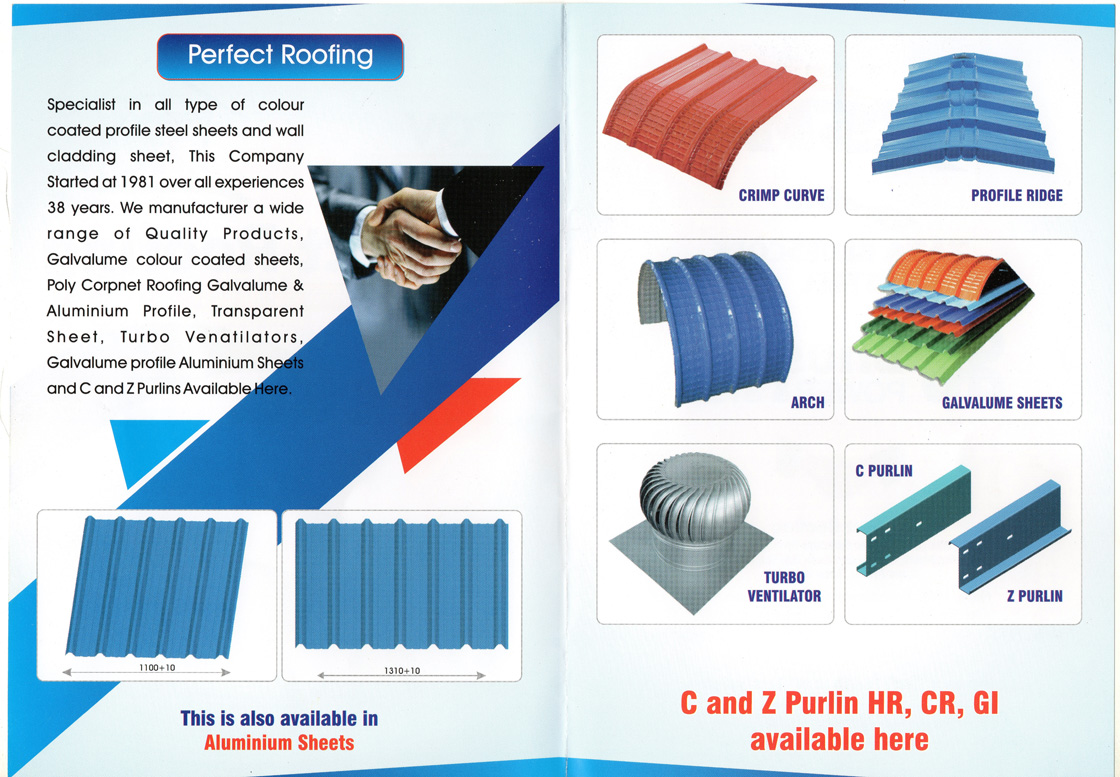 Specialist in all types of colour coated profile steel sheets and wall cladding sheet, This Company started at 1981 overall experiences 38 years. We manufacture a wide range of quality products, Galvalume Colour Coated Sheets, Poly Carpet Roofing Galvalume & Aluminium Profile, Transparent Sheet, Turbo Ventilators, Galvalume Profile Aluminium Sheets and C and Z Purlins available Here.